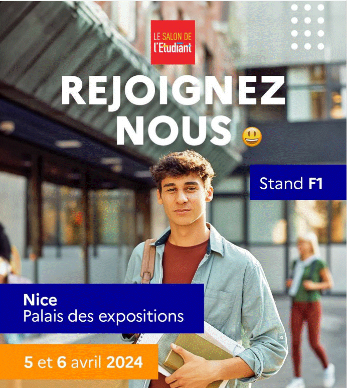 Salon de l'Etudiant à Nice - Stand F1. Vendredi 5 avril de 09h30 à 17h et samedi 6 avril de 10h à 16h. Palais des Expositions.