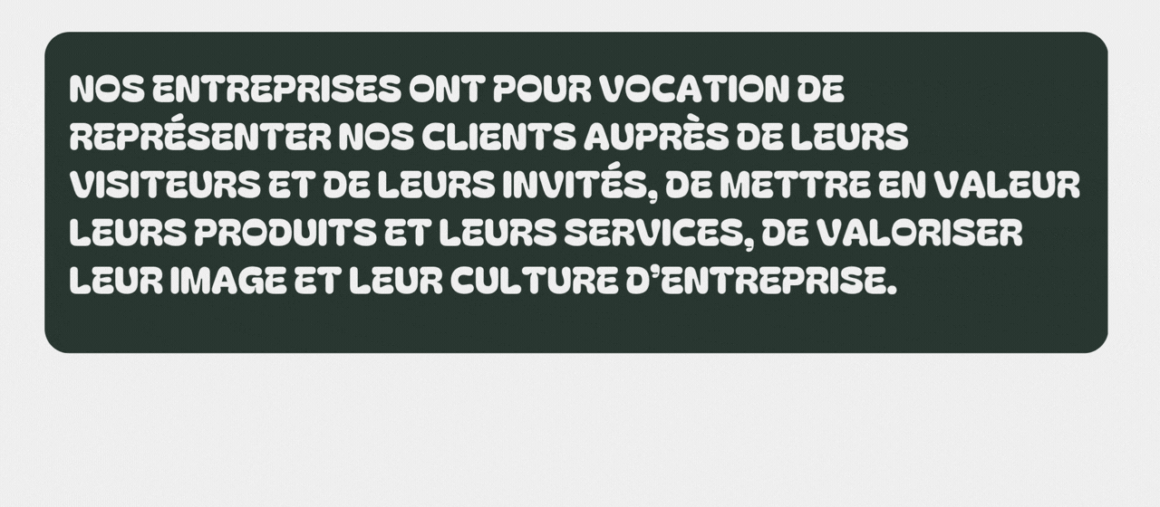 Les entreprises du secteur ont pour vocation de représenter nos clients auprès de leurs visiteurs et de leurs invités, de mettre en valeur leurs produits et leurs services, de valoriser leur image et leur culture d’entreprise. Nos clients le savent…et font naturellement appel à nous pour les accompagner dans leurs nouveaux projets. Y-a-t-il plus grande marque de confiance ?