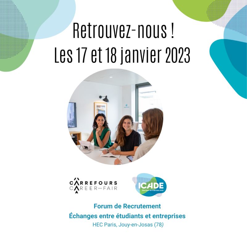 Vous êtes étudiant et le secteur de l'immobilier vous intéresse ? Rencontrez les collaborateurs d'Icade à l'occasion des Carrefours HEC - Career Fair, les 17 et 18 janvier 2023, sur le Campus HEC.